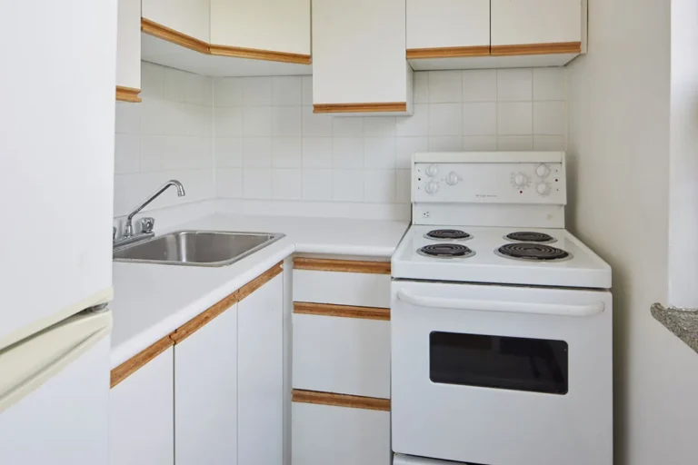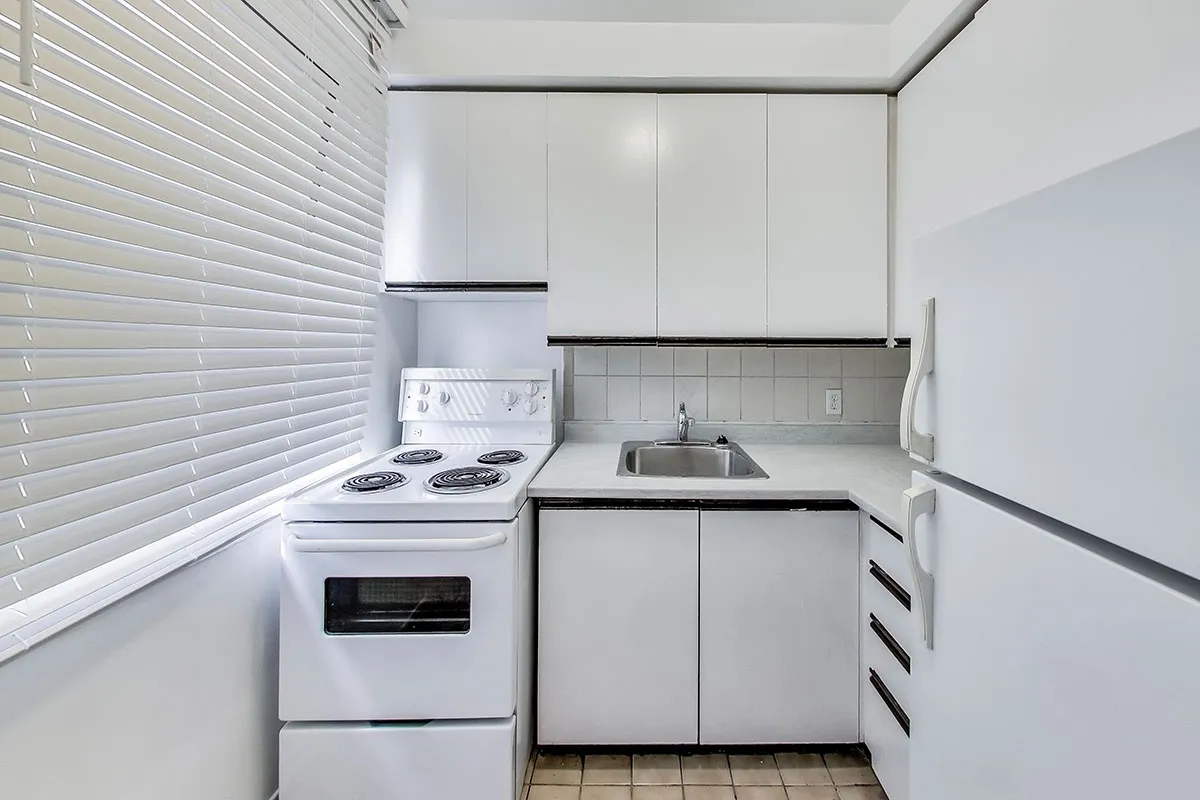 At The Cottingham Manor, bachelor rental apartments are approximately 350-450 square feet of open concept living with a standard private kitchen and bathroom, hardwood floors, and a full size fridge and stove.